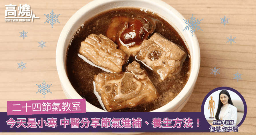 小寒是在天氣最寒冷的「三九」天,從二九到三九間,今年小寒的氣溫合乎正常,體質偏於陽虛的人士,都適合在這個時段適時適當地進補。日常可選擇溫陽食材包括牛肉、羊肉、黃鱔、韭菜、蝦肉、南瓜、櫻桃、栗子、合桃、紅棗、桂圓、糯米等等;或辛辣的香料,如蔥、薑、蒜、八角、花椒、肉桂、小茴香、姜黄等等,作進補之用。